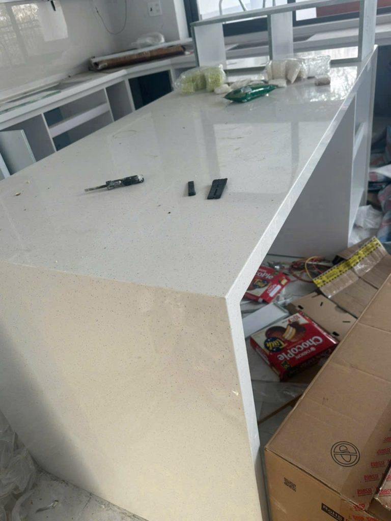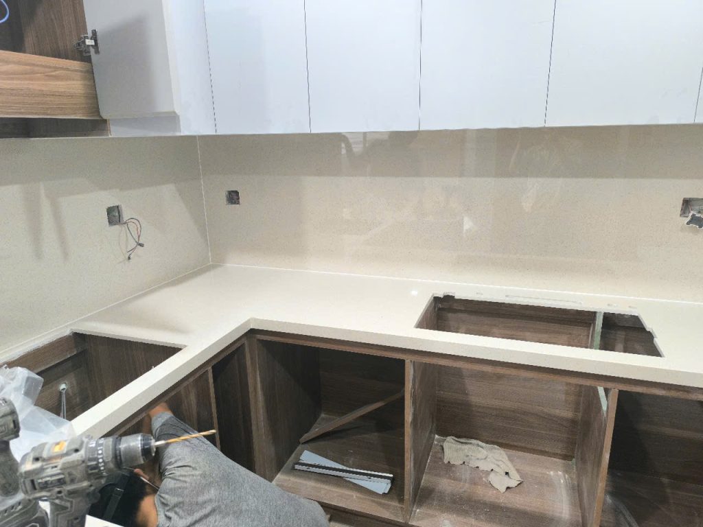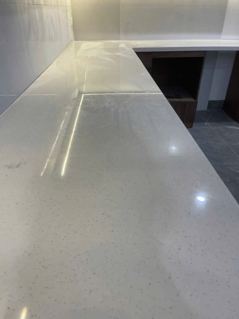 Đá nung kết chấm pi thuộc dạng men cao cấp full màu chấm từ trên đến bên dưới, nên các hạng mục bo cong cạnh mài lên giống như mặt đá.
